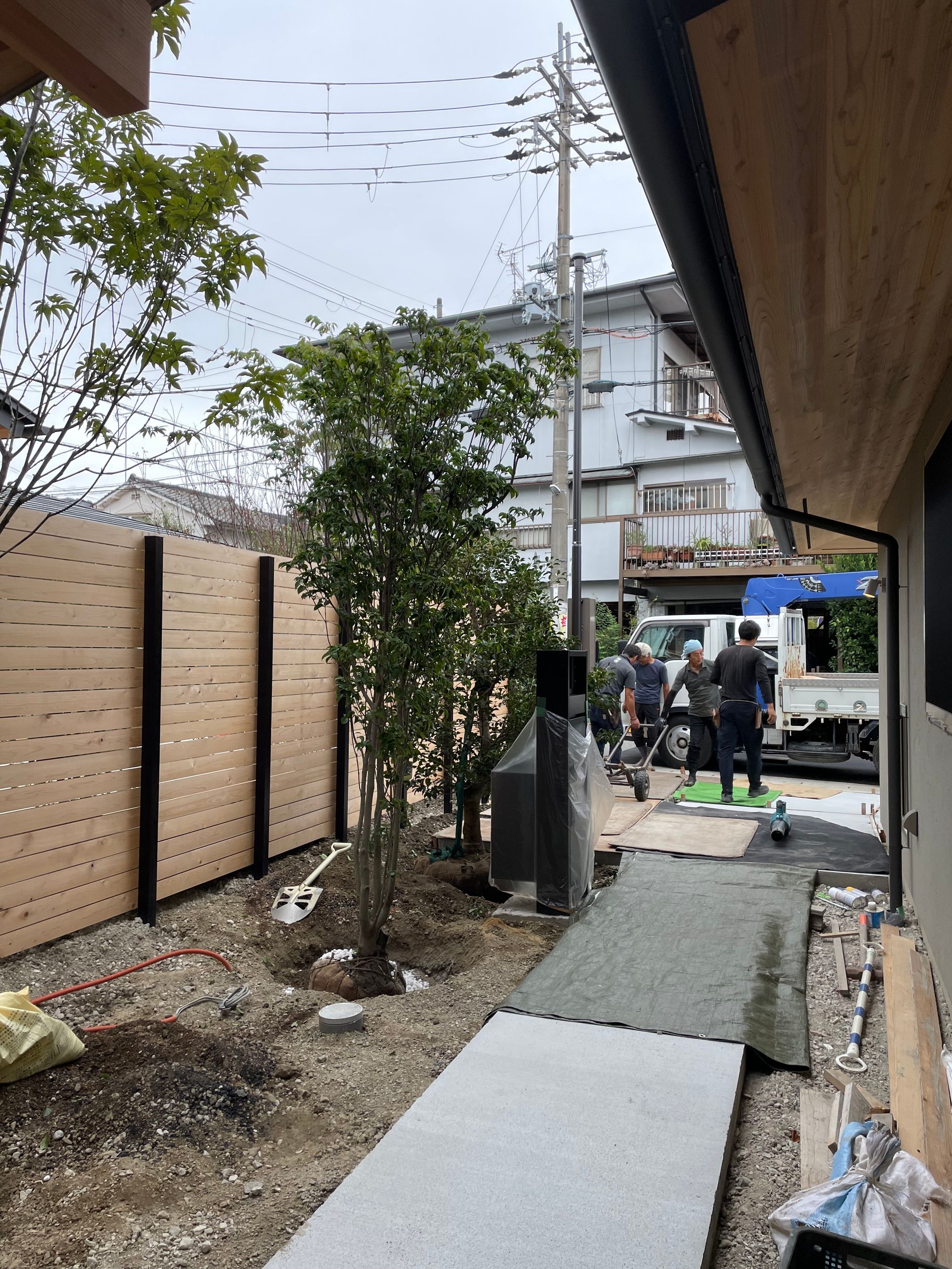 引き渡し前に植栽工事まで完了するかどうかはそれぞれの現場によって変わりますが、今回は引渡し前に植栽含め外構工事を完了させます。 植栽工事は、ほとんどの作業が造園屋さん主導になります。 建物との関係や内部からの見え方、生活する中での植物との関わり方などの意図や希望は事前打合せで伝えますが、施工当日は造園のプロにお任せします。 日々成長する樹木の姿や個々の施主さんのメンテナンス事情を考慮して適切に植樹するのは、建築の設計とは別の職能だからです。 現場立会いは、学ぶことが多く愉しい時間です。