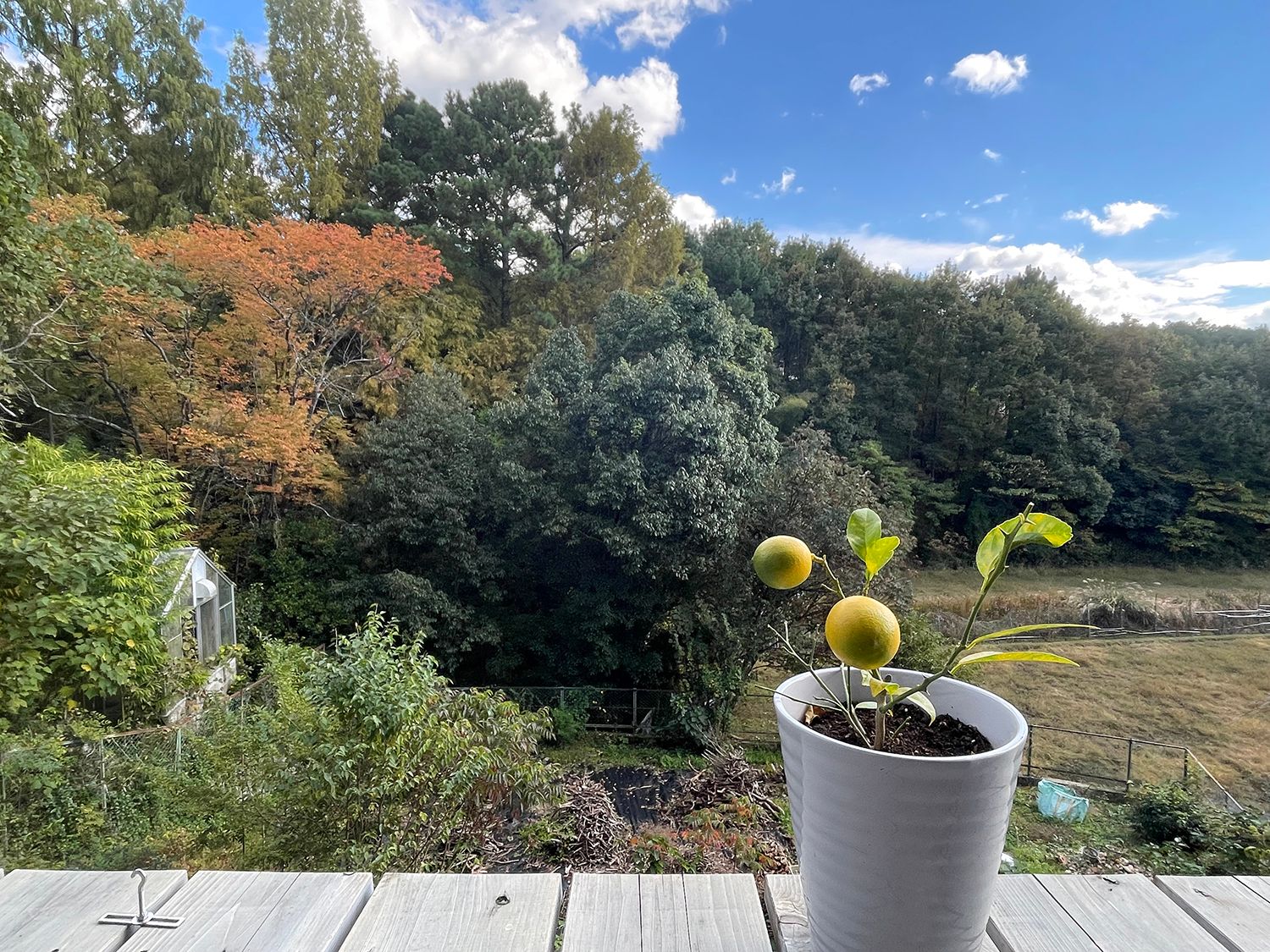 事務所階のデッキからの眺め。 日中の陽射しはまだ暖かですが、朝夕の冷え込みで樹々の紅葉が少しずつ進んでいます。 庭に植えたい果樹のひとつにレモンがあるのですが 岩倉の冬を地植えで越冬できるか不安が残ります。 今年は鉢植えで移動できるようにして苗木を育て もう少し大きくなったら植替えてみようと考えています。 植物と庭の計画も、なかなか進みませんが、 考えることや試してみたいことがたくさんです。