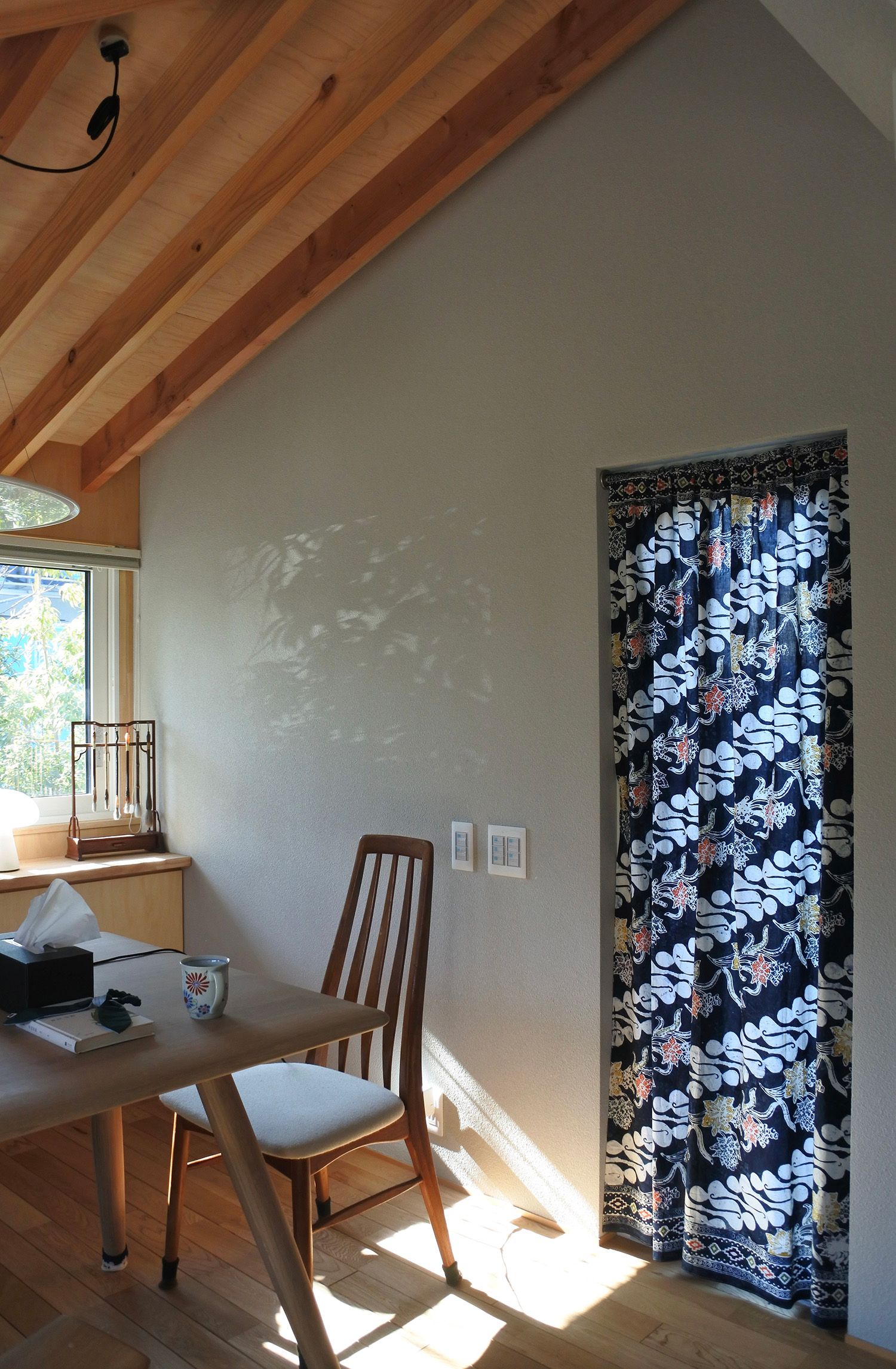 布は様々なサンプルを取り寄せて検討しましたが、最終的にはお施主さん手持ちの1枚を縫製職人さんにお願いしてカーテンに仕立ててもらうことに。