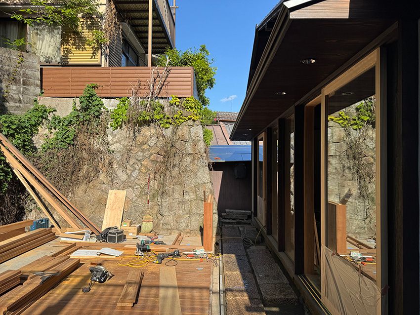 西陣の長屋は内装が終盤、外構工事が進んでいます。路地最奥の長屋ですが、その奥に空地がある珍しい立地です。その空地に生活を拡張できるような屋内外の関係を考えています。